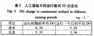 運(yùn)行初期,湖水經(jīng)過人工濕地處理后DO值下降了15.9%,而一年后下降了36.4%。DO值下降的原因可能是植物長高、長密后,各部位出水(跌水、復(fù)氧)受到影響所致。系統(tǒng)運(yùn)行初期與一年后DO值變化見表3。