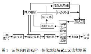 圖1 是活性炭纖維吸附—催化燃燒工藝流程框圖, 整個(gè)系統(tǒng)集吸附、脫附、催化燃燒于一體。