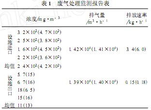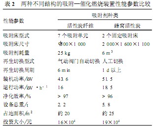 表1 結(jié)果表明, 經(jīng)新型凈化裝置處理后主要廢氣出口濃度低于40mg/m3,符合國(guó)家及地方排放標(biāo)準(zhǔn), 凈化效率達(dá)95.6%~97%。在處理同樣風(fēng)量的情況下, 此套裝置與目前常用的以蜂窩炭為吸附劑的吸附—催化燃燒裝置相比較具有明顯的優(yōu)點(diǎn), 具體數(shù)據(jù)見(jiàn)表2。