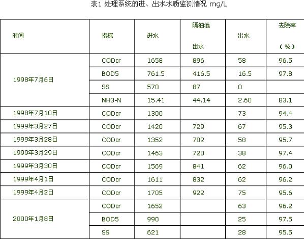 從表中數(shù)據(jù)可見,宰雞廢水經(jīng)本系統(tǒng)處理,COD去除率為94.4%~97.5%,大多在95%以上,出水COD均低于75mg/L;BOD去除率為97.5%以上;SS 去除率為95.5%以上;NH3-N去除率為83.1%。運(yùn)行表明,pH值為9.60的堿性廢水進(jìn)入隔油沉淀池后,其出水pH值降至6.96,產(chǎn)生酸化作用,這可能也是隔油常常池去除率高的一個(gè)原因。而此過程中,NH3-N明顯升高,證實(shí)了確已發(fā)生生化反應(yīng)。