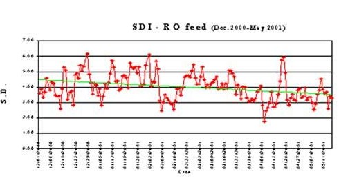 原工業(yè)用水有時SDI值(>6)及TSS(6-6.5ppm)很高,這偶爾導(dǎo)致RO給水的SDI值超過 4 。