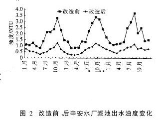 辛安水廠源水取自黃河最下游,污染較為嚴重。本次改造工程于2002年5月30日投入試運行,改造后與改造前對比表明:改造后的V型濾池達到無人操作,運行穩(wěn)定,工作周期比原虹吸濾池大大延長,濾后水濁度<1 NTU(見圖2),出水水質(zhì)明顯優(yōu)于虹吸濾池。
