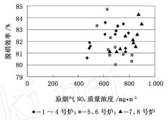 圖2 原煙氣 NOx質(zhì)量濃度與脫硝效率的關(guān)系 |