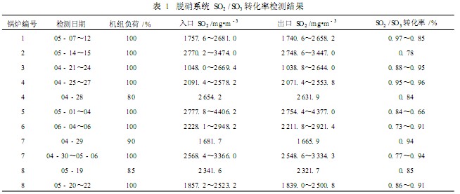 在不同工況和燃用不同煤種的情況下 ,檢測脫硝系統(tǒng)進(jìn)、 出口 SO2 濃度 ,再以此計(jì)算出 SO2 /SO3 轉(zhuǎn)化率 , 1~8號爐脫硝系統(tǒng)檢測結(jié)果見表 1。