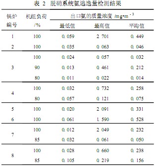 從表 2可見 , 1~8號爐 SCR脫硝系統(tǒng)出口氨的質(zhì)量濃度最高為 2 . 701mg/m3 ,最低 0 . 020mg/m3 。