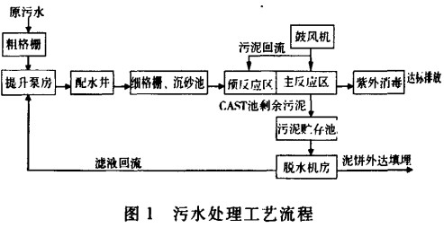 從市政管道收集來(lái)的生活污水自流人提升泵房,先由粗格柵截留較粗的垃圾和漂浮物后,提升泵將污水抽提至配水井;又經(jīng)細(xì)格柵濾去較小的懸浮垃圾物質(zhì),并在旋流沉砂池的作用下,去除水中比重較大的砂粒等無(wú)機(jī)顆粒,流入CAST反應(yīng)池,與回流的活性污泥在生物選擇池混合,從CAST池預(yù)反應(yīng)區(qū),到主反應(yīng)區(qū),經(jīng)歷曝氣、沉淀階段后,從潷水器至消毒渠,經(jīng)紫外線消毒后排放到淡澳河。