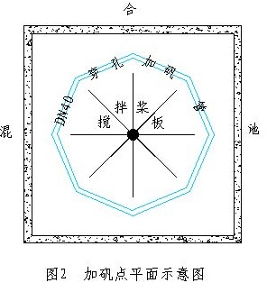 兩個加礬點(diǎn)分別設(shè)在兩座混合池下,加礬管在混合池內(nèi)部分采用DN40PVC-U穿孔管并做成正八邊型,圍住攪拌機(jī)下面的八片槳葉,從而確保加入的礬液能夠隨著攪拌機(jī)攪動產(chǎn)生的水流迅速均勻地擴(kuò)散到水中與原水充分混合。(礬投加方式見下面圖2)