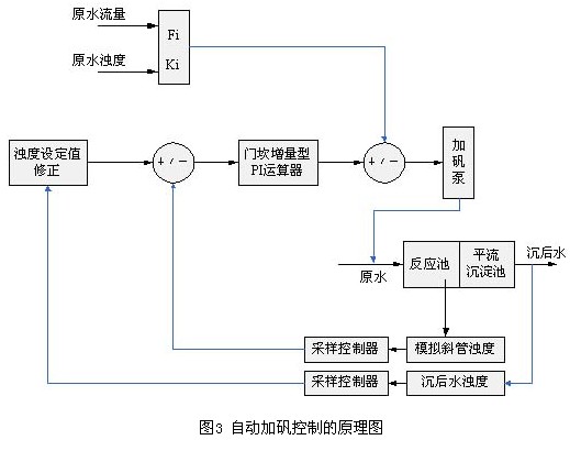 (1)自動調(diào)節(jié)控制加礬量:自動加礬采用多參數(shù)復(fù)合環(huán)控制方法,即根據(jù)原水流量、濁度進(jìn)行前饋控制,根據(jù)模擬沉淀水濁度(在絮凝池末端上向流處安裝一小型斜管,斜管上端清水區(qū)安有連續(xù)在線測定濁度儀,根據(jù)斜管沉淀快的原理來模擬沉淀水濁度)即時反饋進(jìn)行復(fù)合環(huán)控制,再根據(jù)實際沉淀水濁度進(jìn)行一定程度的微調(diào)修正。從而既能迅速響應(yīng)原水的水質(zhì)變化,快速調(diào)節(jié)加礬量,又能自動跟蹤沉淀水濁度進(jìn)行適當(dāng)調(diào)整,在保證沉后水濁度指標(biāo)的同時節(jié)約礬耗。(復(fù)合環(huán)控制加礬的模式見下面圖3)