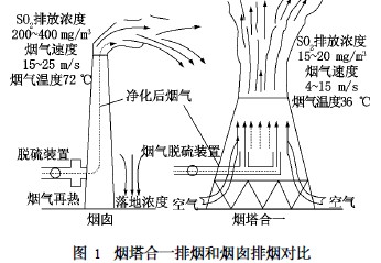 從圖1可以看出煙塔合一技術(shù)與傳統(tǒng)煙囪排煙有較大的不同。