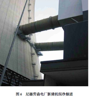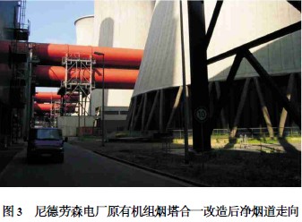 尼德勞森電廠新建煙塔合一機組為978 MW燃燒褐煤的超臨界機組,于2002 年11月啟動運行。鍋爐為Alstom - EVT 生產(chǎn)的塔型爐,燃燒器八角布置單切圓燃燒,采用低氮燃燒器,沒有建設脫氮設備。煙氣分二路分別進入2 套石灰石石膏濕法脫硫塔,脫硫后凈煙氣在脫硫塔頂部直接水平進入冷卻塔中心(下傾角為1°) 。煙塔合一設計脫硫后凈煙氣流量2 ×191 萬m3Ph ,對應冷卻塔熱空氣量為8 208 萬m3Ph。尼德勞森電廠全景見圖2。