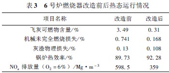 鍋爐燃燒器改造前后熱態(tài)運(yùn)行情況詳見表3。通過對比表3中改造前后鍋爐運(yùn)行情況,可以看到燃燒器改造前后,鍋爐總體情況得到改善,鍋爐的機(jī)械未完全燃燒損失降低,排煙溫度降低,排煙熱損失減少,煤粉燃燒情況好轉(zhuǎn),飛灰可燃物含量大大降低,燃燒效率提高,特別是NOx排放量由改造前的598.5Mg/m3減少到359Mg/m3,充分說明合理采用分級燃燒可以有效地降低燃燒過程中NOx的生成量,使NOx排放量低于國家標(biāo)準(zhǔn)。因此,對大容量褐煤鍋爐進(jìn)行爐內(nèi)分級燃燒技術(shù)改造可以提高鍋爐的熱效率,降低NOx排放量,減輕爐內(nèi)結(jié)渣。
