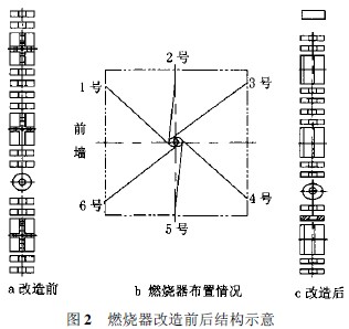 (3)為減少燃燒初期氧量,將原中二次風(fēng)口偏轉(zhuǎn)二層,偏離原燃燒器切圓中心線約7°,加大切圓直徑;