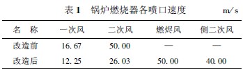 (4)在燃燒器上方約1m左右的位置增設(shè)一層燃燼風(fēng)口,流通截面占原有二次風(fēng)口流通截面的15%左右,氣流方向和偏轉(zhuǎn)后的二次風(fēng)氣流相同。燃燒器改造前后的結(jié)構(gòu)如圖2所示,該爐配風(fēng)情況見表1。