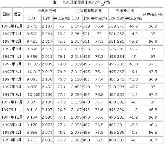 根據(jù)浙江海門制藥廠所提供1996年12月~1998年3月份的監(jiān)測記錄表,在進(jìn)水量為10m3/h,水溫35℃~36℃的情況下,各處理構(gòu)筑物的CODCr指標(biāo)采用加權(quán)平均法進(jìn)行整理,其結(jié)果詳見表1。