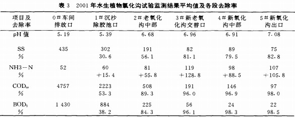 (2)監(jiān)檢結(jié)果:西雙版納州環(huán)境監(jiān)測站于2000年11月17~19日進行了連續(xù)三天的竣工驗收監(jiān)測,結(jié)果見表2。2001年在利用水生植物治理橡膠廢水的試驗中,又對氧化溝分段進行了分析,并分別取樣,通過送樣進行檢測分析,其檢測結(jié)果平均值及各段對污染物的去除率見表3。