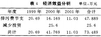 四膠廠若不興建橡膠廢水治理設(shè)施,廢水直排從1999~2001年就需上繳各種排污費、超標排污費及罰款等共計5O.99萬元。而設(shè)施建成后三年只上繳了排污費1萬元,加上三年運行費用2.1萬元,三年共節(jié)支47.889萬元。另一方面四膠廠若采用傳統(tǒng)的氧化塘工藝,需要投資61.3萬元,而使用水生植物氧化溝、兼性塘治理工藝只投資了35.7萬元,節(jié)約投資25.6萬元。上述兩項合計三年共節(jié)支了73.489萬元,投入產(chǎn)出比1:2.05,因此具有較好的經(jīng)濟效益,見表4。
