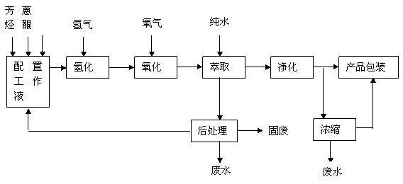%</h>的雙氧水1.5萬(wàn)噸,廢水處理工程的設(shè)計(jì)規(guī)模為240m3/d。工程于2003年3月竣工驗(yàn)收,經(jīng)過(guò)一年多的運(yùn)行,有穩(wěn)定的處理效果。雙氧水生產(chǎn)工藝為鈀觸媒、2-乙基蒽醌法。廢水主要來(lái)自于過(guò)氧化氫生產(chǎn)車間的各種廢水排放。生產(chǎn)工藝流程及排污節(jié)點(diǎn)如下:" />