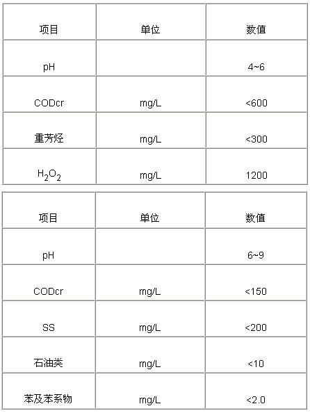 該廢水主要含有:2-乙基蒽醌、磷酸三辛酯、三甲苯及雙氧水。廢水中含有難降解的芳香烴及對(duì)生化反應(yīng)有毒害作用的雙氧水。磷酸三辛酯和三甲苯均為不溶于水的有機(jī)溶劑,密度比水略輕,磷酸三辛酯的相對(duì)密度ρ=0.924,三甲苯的相對(duì)密度ρ=0.86。廢水中各項(xiàng)主要污染物參數(shù)如下表: