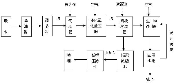 針對(duì)該廢水的特性,制定出先除油,然后采用催化氧化反應(yīng)打開苯環(huán),降解大部分芳香烴類有機(jī)物,最后通過(guò)活性碳吸附殘留有機(jī)物,確保達(dá)標(biāo)排放。具體工藝流程如下圖:
