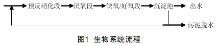 珠海市拱北污水處理廠始建于1985年,總占地面積15.8公頃,規(guī)劃總處理量為11萬(wàn)噸/日,服務(wù)面積2200公頃,服務(wù)人口約22萬(wàn)。主要處理拱北、前山片區(qū)內(nèi)的城市污水。該廠建設(shè)分成三期工程完成,其中一期工程于1992年2月投入運(yùn)行;二期工程于1998年4月投入運(yùn)行;三期工程于2002年8月投入運(yùn)行。一、二期工程的處理工藝相同,均為傳統(tǒng)活性污泥法工藝。由于能耗大,工藝落后,現(xiàn)已進(jìn)行改造擴(kuò)建。現(xiàn)在運(yùn)行的是三期工程,全套工程引進(jìn)意大利EMIT公司的技術(shù),包括SCADA控制系統(tǒng)。三期工程的處理工藝采用AAO生物除磷脫氮工藝,鼓風(fēng)曝氣,設(shè)計(jì)規(guī)模為8萬(wàn)噸/日,占地8.3公頃。該工藝是改良的AAO工藝,與典型的AAO工藝所不同的是:構(gòu)筑物在空間上沒(méi)有嚴(yán)格分開,且在生物池內(nèi)缺氧與好氧(即硝化與反硝化)多重復(fù)一次,從而取代了AAO典型工藝中的內(nèi)回流系統(tǒng)。其主要特點(diǎn)是生物系統(tǒng),整個(gè)生物系統(tǒng)流程見圖1。