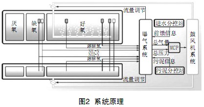 5)在污水處理的成本中,電耗是一大項(xiàng),要有效地控制成本,如何節(jié)約電費(fèi)是一個(gè)重要環(huán)節(jié)。拱北廠三期項(xiàng)目的用電成本占污水處理成本的50%左右,而生物池鼓風(fēng)機(jī)的用電量占總用電量的60%左右。所以,鼓風(fēng)機(jī)的曝氣控制對(duì)污水處理成本至關(guān)重要。設(shè)計(jì)曝氣系統(tǒng)時(shí),引入了“前饋+后饋+模型”組合的多參數(shù)控制方式,可大大減少鼓風(fēng)機(jī)的耗電量。其系統(tǒng)原理如圖2所示。