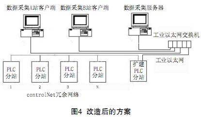 改造后,所有的分站數(shù)據(jù),包括擴(kuò)建工程的分站數(shù)據(jù)都通過(guò)工業(yè)以太網(wǎng)傳輸?shù)綌?shù)據(jù)采集服務(wù)端。數(shù)據(jù)服務(wù)端采集分站數(shù)據(jù)進(jìn)行存儲(chǔ)和處理。這里需要特別說(shuō)明的是,由于所選用的網(wǎng)絡(luò)具有透明性,數(shù)據(jù)服務(wù)器可以直接訪問(wèn)ControlNet網(wǎng)絡(luò)上的各個(gè)分站,擴(kuò)建后任意工業(yè)以太網(wǎng)結(jié)點(diǎn)上的分站和ControlNet網(wǎng)絡(luò)上的各個(gè)結(jié)點(diǎn)也可以互相通訊。數(shù)據(jù)采集客戶端從服務(wù)器端數(shù)據(jù)庫(kù)訪問(wèn)數(shù)據(jù),并可實(shí)現(xiàn)對(duì)所有分站的監(jiān)控。