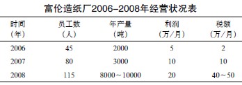 富倫造紙廠在生產(chǎn)過(guò)程中的廢水分段回收利用率達(dá)80%,另20%的廢水經(jīng)二級(jí)生化處理,又可回收利用10%。噸紙耗水量保持在10噸左右,遠(yuǎn)遠(yuǎn)低于國(guó)家規(guī)定的污水排放標(biāo)準(zhǔn)。該廠通過(guò)不斷的技術(shù)創(chuàng)新,取得了良好的經(jīng)濟(jì)、社會(huì)效益,先后被授予杭州市循環(huán)經(jīng)濟(jì)示范企業(yè)、富陽(yáng)市環(huán)境保護(hù)教育基地、富陽(yáng)市清潔生產(chǎn)先進(jìn)單位等稱號(hào)。富倫造紙廠2006-2008年經(jīng)營(yíng)狀況見(jiàn)下表。