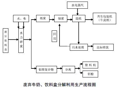 2004年初,該廠實(shí)施了對(duì)廢棄牛奶、飲料盒分離再利用項(xiàng)目。企業(yè)經(jīng)過(guò)近一年的研發(fā),成功掌握了一套較為完整的分解技術(shù)(核心技術(shù)已申請(qǐng)中國(guó)專利),將廢棄的牛奶、飲料盒在安全環(huán)保的基礎(chǔ)上實(shí)現(xiàn)了紙和鋁塑的分離。分離出來(lái)的紙漿是生產(chǎn)高檔牛皮紙的原料,而鋁塑復(fù)合物經(jīng)過(guò)分離可加工成鋁錠和工業(yè)石蠟等,實(shí)現(xiàn)了廢棄物-再生資源的良性循環(huán)。該企業(yè)采用的處理設(shè)備和生產(chǎn)工藝都不同于傳統(tǒng)造紙企業(yè),在富陽(yáng)市的眾多造紙企業(yè)中獨(dú)樹(shù)一幟,實(shí)現(xiàn)了不可降解廢棄物的循環(huán)利用。其利用廢棄牛奶、飲料盒的生產(chǎn)工藝流程見(jiàn)下圖。