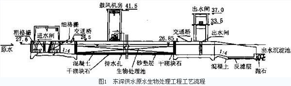 東深原水經(jīng)沉砂區(qū)去除大的砂粒,再由粗格柵攔截大的漂浮物,細(xì)格柵攔截小的漂浮物及懸浮物后,進(jìn)入該工藝的主體--生物處理池,使有機(jī)污染物和氨氮因氧化作用而得到降解。詳見(jiàn)東深供水原水生物處理工程工藝流程(圖1)。