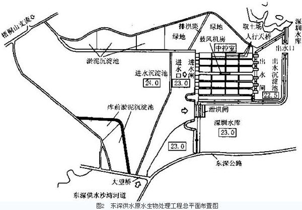 生物處理池最大外形尺寸為316.5m×200m,面積約6.33萬(wàn)m2,屬砼和鋼筋砼結(jié)構(gòu),設(shè)6條寬25m,長(zhǎng)27m過(guò)水廊道,生物池底坡降采用2.5‰,進(jìn)出水口分別設(shè)進(jìn)水閘門(mén)和出水閘門(mén),處理池頂垂直于廊道隔墻設(shè)三座人行橋,在處理池的中央隔墻頂設(shè)61m×10m鼓風(fēng)機(jī)房一座。詳見(jiàn)東深供水原水生物處理工程總平面布置圖(圖2)。