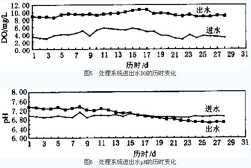 生物硝化過(guò)程是一個(gè)耗氧、耗堿度的過(guò)程,故處理系統(tǒng)進(jìn)、出水DO和pH的變化說(shuō)明了填料掛膜的進(jìn)程和生物硝化作用進(jìn)行的程度(見(jiàn)圖5和圖6)。