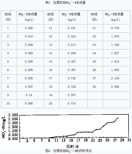 由表2可見(jiàn),隨著填料上硝化細(xì)菌的生長(zhǎng)繁殖,處理池消化能力的逐步發(fā)揮,雖然氨氮去除率有時(shí)因進(jìn)水氨氮濃度突增而波動(dòng),但硝酸鹽氮生成量仍穩(wěn)步增加,這也表明池內(nèi)生物膜正日趨成熟。