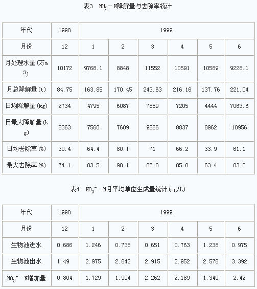 從表3可看出,1998年12月是工藝啟動(dòng)階段,氨氮降解量和去除率都比較低,工藝運(yùn)行穩(wěn)定后逐步升高;5月份由于設(shè)備維修,工藝運(yùn)行不穩(wěn)定,處理效果偏低;6月份已逐步恢復(fù)正常運(yùn)行。