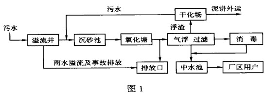 針對氧化塘出水生化性較差的特點,選擇以氣浮、過濾、消毒為主要設(shè)備處理工藝,對氧化塘出水進行再處理。同時考慮到工廠中西區(qū)污水中含有油類及部分粗顆粒雜質(zhì)對處理系統(tǒng)的不利影響,在氧化塘前增設(shè)了預(yù)處理沉沙隔油池。設(shè)計能力為6000t/d,回用中水能力為3000時/d,總投資630余萬元。