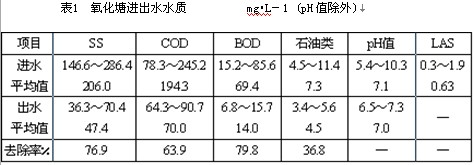 污水經(jīng)管道流入平流式沉沙池,沉沙池前后設(shè)置粗、細格柵,以截留較粗的雜物;在沉沙池前設(shè)置溢流井,作為夏季雨水及事故排放,以防止對后序污水處理系統(tǒng)的沖擊。沉沙池出水采取淹沒出水方式,起到隔油及沉降作用,污水經(jīng)明渠然后進入氧化塘。氧化塘長200m,寬44m,有效面積為8800m2。水流停留時間為1.2d。氧化塘內(nèi)種植蘆葦,污水中大部分SS、COD等污染物在塘內(nèi)得到有效沉降、分解和去除。經(jīng)氧化塘處理后的出水水質(zhì)完全達到了污水綜合排放一級標準(GB8978-1996 )。氧化塘進出水水質(zhì)見表1。