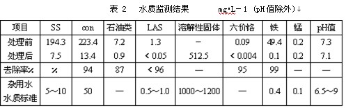 氧化塘出水一部分再經(jīng)泵提升,進入氣浮過濾池,進行回用處理,其余未回用處理部分,經(jīng)管道排入廠區(qū)外市政管道。氣浮池采取平流式設(shè)計,在氣浮池前進水管加堿式氯化鋁混凝劑,對污水進行混凝氣浮。氣浮池水流停留時間為38min,氣浮采用局部回流,回流比為30%,回流用水來自過濾出水;污水經(jīng)氣浮后,進入過濾池,過濾采用重力式下向流雙層過濾池,濾料采用無煙煤(上層)和石英砂(下層)。污水經(jīng)氣浮過濾處理后,污水中SS、COD、石油類去除率分別可達90%、85%、88%以上。為防止中水回用管路系統(tǒng)微生物腐蝕,確;赜盟l(wèi)生安全,對過濾出水需投加消毒劑進行消毒。消毒措施是采用次氯酸鈉發(fā)生器產(chǎn)生次氯酸鈉,并經(jīng)管道混合向中水池中投加,接觸時間大于1h。氣浮過濾出水經(jīng)投加消毒劑后,自流進入中水池(2座,每座有效容積為500m3),再經(jīng)泵提升回用于廠區(qū),用于車體試漏試壓、工業(yè)冷卻、采暖補水、鑄鋼清砂洗砂以及清洗、綠化等處用水。出水水質(zhì)監(jiān)測指標見表2。