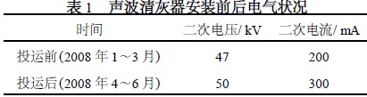聲波清灰器投運(yùn)前后機(jī)頭電除塵器1-1 電場(chǎng)平均二次電壓、二次電流變化見(jiàn)表1 。通過(guò)一段時(shí)間的跟蹤觀察,總結(jié)如下: