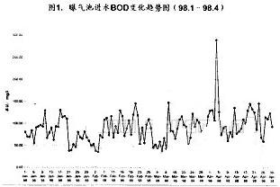 從圖1看到,曝氣池進(jìn)水BOD5 在98年1月份普遍偏低,基本上處于100mg/l以下,特別是從下旬開始,處于明顯的下降趨勢(shì),最低曾達(dá)40mg/l。