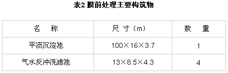 由于膜處理對(duì)進(jìn)水要求較高,膜前處理主要是對(duì)源水進(jìn)行預(yù)處理,達(dá)到膜進(jìn)水的要求。主要構(gòu)筑物如表2所示。
