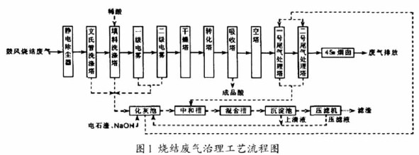 燒結(jié)機(jī)廢氣治理設(shè)施采用靜電除塵- 非穩(wěn)態(tài)一轉(zhuǎn)一吸制酸工藝一濕式石灰石膏法脫硫工藝。由于取材方便,企業(yè)實(shí)際采用樹脂廠廢電石渣(有效成分為氫氧化鈣)代替石灰,為了進(jìn)一步提高脫硫效率,同時添加部分氫氧化鈉。具體工藝流程見圖l。