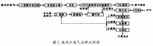 鼓風(fēng)爐廢氣治理設(shè)施采用布袋除塵一濕式石灰石膏法脫硫工藝,具體工藝流程見圖2。