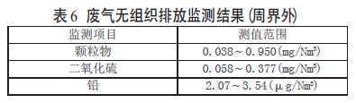 在粗鉛生產(chǎn)線燒結(jié)原料系統(tǒng)、燒結(jié)機(jī)尾鼓風(fēng)爐輸料系統(tǒng)以及電解鉛生產(chǎn)線粗鉛、精鉛熔化等工序均分別采取相應(yīng)布袋除塵治理措施的情況下,該廠周界外(廠界外10m 范圍內(nèi))廢氣無組織排放監(jiān)測結(jié)果見表6。