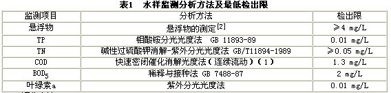 水樣監(jiān)測的項目有懸浮物、透明度、TP、TN、COD、BOD5和葉綠素a,上述項目監(jiān)測分析方法及最低限見表1。