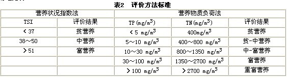Vollenweider于l969年提出湖泊營養(yǎng)狀況與營養(yǎng)物質(zhì),特別是與TP、TN濃度之間有密切關(guān)系。在一定范圍內(nèi),TP、TN負(fù)荷增加,藻類生物量增加,魚類產(chǎn)量也增加,水庫的富營養(yǎng)化加劇。這種關(guān)系受到水體平均深度、面積、水力停留時間等因素的影響。該方法根據(jù)TP、TN濃度將湖泊、水庫富營養(yǎng)狀況分為貧營養(yǎng)、貧-中營養(yǎng)、中-富營養(yǎng)、富營養(yǎng)、重富營養(yǎng)五種等級,該方法不僅簡便,而且應(yīng)用很廣泛。詳細(xì)評價標(biāo)準(zhǔn)見表2。