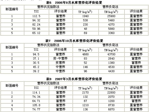 本研究采用了營養(yǎng)狀況指數(shù)法(TSI)和營養(yǎng)物質(zhì)負(fù)荷法(Vollenweider)兩種方法同時對水庫營養(yǎng)化進(jìn)行評價,結(jié)果見表6、表7、表8。