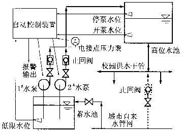 高校校園的供水和一般城市供水相比較為特殊。主要是由于校園內(nèi)學(xué)生住宿區(qū)一般都較為集中,造成了學(xué)生宿舍、食堂的用水十分集中,且用水量較大。而其它建筑物如教室、實驗室、教師住宿區(qū)等的用水量則相對較少。同時,用水的時間性強,一般在早上6∶00~8∶00,中午11∶00~2∶00,下午5∶00~7∶00,晚上9∶00~10∶00四個時間段用水量最大,而其它時間則用水量一般。某高校的某區(qū)供水方式為:把城市自來水管網(wǎng)的水源取到蓄水池后,用水泵抽到校園內(nèi)高位水池,再由高位水池向校園管網(wǎng)供水。隨著高校的擴招,學(xué)生人數(shù)顯著增多,造成了經(jīng)常性的供水不足,特別是學(xué)生宿舍和食堂最為明顯,影響了學(xué)生和教師的正常生活秩序,同時該供水方式還存在如下問題:
