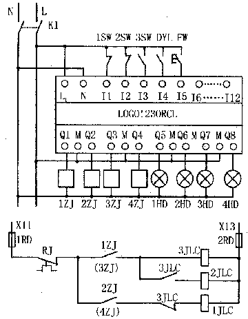 圖2為硬件接線原理圖,其中1SW為蓄水池低限水位,2SW為開泵水位,這兩個水位均采用常閉觸點。3SW為停泵水位,DYL為電接點壓力表輸出觸點,F(xiàn)W為水泵報警復(fù)位點動按鈕觸點,這三個觸點均采用常開觸點。這樣設(shè)置常開和常閉觸點,可使LOGO!的輸入在大部分工作時間內(nèi)為無電壓狀態(tài),只有短時間內(nèi)會出現(xiàn)帶電狀態(tài)。中間繼電器1ZJ,2ZJ用于1#水泵,3ZJ,4ZJ用于2#水泵。報警指示燈1HD用于 1#水泵故障報警,2HD 用于2#水泵故障報警,3HD用于蓄水池水位過低報警,4HD 用于高位水池液位開關(guān)故障報警。1JLC為水泵正常運行接觸器,2JLC為減壓啟動接觸器,3JLC為星點接觸器。RJ為熱繼電器觸點,RD為熔斷器,K1為LOGO!電源的保護空氣開關(guān)。
