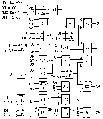 當高位水池的水位降到開泵水位后,工作泵啟動,如果工作泵故障,則備用泵啟動,當水位升到停泵水位后,水泵停止工作;當蓄水池水位降到低限水位以下時,報警指示燈3HD 點亮,同時禁止啟動水泵,對于此前已啟動的水泵,則立即停止,以防水泵因無水而空轉(zhuǎn)。當高位水池的液位開關(guān)出現(xiàn)邏輯錯誤時,即停泵水位顯示有水,而開泵水位顯示無水,則報警指示燈4HD點亮,同時禁止啟動水泵,對于此前已啟動的水泵,則立即停止,以防水泵因液位開關(guān)故障而誤動作。當水泵運行15 s(根據(jù)試驗確定)后,如果電接點壓力表觸點DYL 未閉合,即水泵壓力未達到預(yù)定值,則說明水泵抽水失敗,判斷為水泵故障。此時,把故障水泵退出運行,點亮報警指示 燈,并進行鎖定,直到修復(fù)后,由人工用復(fù)位按鈕FW進行復(fù)位,才能再次開啟水泵。水泵的減壓啟動邏輯過程為:LOGO!的輸出Q1(或Q3)閉合后,中間繼電器1ZJ(或3ZJ)閉合,使交流接觸器3JLC和2JLC閉合,并啟動軟件延時,延時10 s(根據(jù)自耦減壓啟動器要求設(shè)定)后,1ZJ(3ZJ)跳開,使 3JLC,2JLC退出運行,最后通過Q2(或Q4)使中間繼電器2ZJ(或4ZJ)閉合,啟動交流接觸器1JLC。工作泵和備用泵的自動切換功能是利用LOGO!230RCL的時鐘功能來實現(xiàn)的,即在周一凌晨零點至周四中午12點時間內(nèi),1#水泵為工作泵,2#水泵為備用泵,而在其它時間則反過來;當然,也可用運行時間計時器或日歷觸發(fā)開關(guān)來實現(xiàn)。另外,LOGO!的I1~I4輸入信號均采用軟件延時方式,延時時間為5 s,即要求信號要能保持5 s以上,才認為該輸入存在,以防液面波動、壓力脈動或其他原因引起的開關(guān)抖動而導(dǎo)致誤操作。