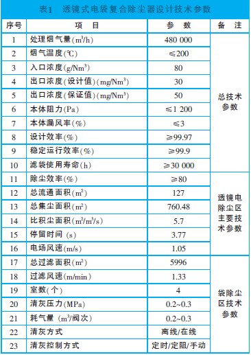 1 透鏡式電袋復(fù)合除塵器設(shè)計(jì)技術(shù)參數(shù)(見表1)