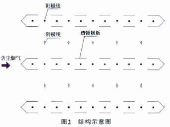 (2)負(fù)電暈極、透鏡極和正電暈極在空間位置交錯排列,垂直懸掛于除塵器殼體內(nèi);透鏡極由透鏡板排平行構(gòu)成,透鏡板排由多塊長條導(dǎo)體薄板制成的透鏡板在同一平面按一定間距平行并列組成,透鏡板排平面相鄰兩塊透鏡板側(cè)向之間的間隙為透鏡口,平行并列兩排透鏡板排連同前后端分流、阻流裝置圍成的空間為收塵室單元,相鄰兩個收塵室單元之間的區(qū)域?yàn)闊煔馔ǖ;?fù)電暈極線以一定距離平行排列組成陰極框,垂直吊掛在煙氣通道空間內(nèi)與透鏡極板平面平行的中線位置;正電暈極線懸掛于收塵室單元透鏡口內(nèi)的中心點(diǎn);每根負(fù)電暈極線和正電暈極線都正對透鏡口,空間位置與透鏡板平面正交;當(dāng)負(fù)電暈極接入 GGAJ02-0.5A120KV 負(fù)高壓工頻電源、正電暈極接入 GGAJ02-0.5A/40KV 正高壓工頻電源、透鏡極接地時, 透鏡極是負(fù)電暈極和正電暈極的電離公共響應(yīng)極,正、負(fù)電暈極與透鏡單元形成類似光學(xué)透鏡聚焦作用的收塵電場;進(jìn)入煙氣通道的粉塵在收塵電場中荷電,并在透鏡趨軸效應(yīng)力的作用下穿過透鏡口向收塵室驅(qū)進(jìn);正電暈極不僅強(qiáng)化了收塵電場,加快了粉塵的驅(qū)進(jìn)速度,而且它所發(fā)射的正電荷可以滿足負(fù)電性粉塵釋放電荷的需要; 進(jìn)入收塵室的粉塵相互碰撞,凝聚,結(jié)粒,最終沉降于灰斗被收集外運(yùn)。